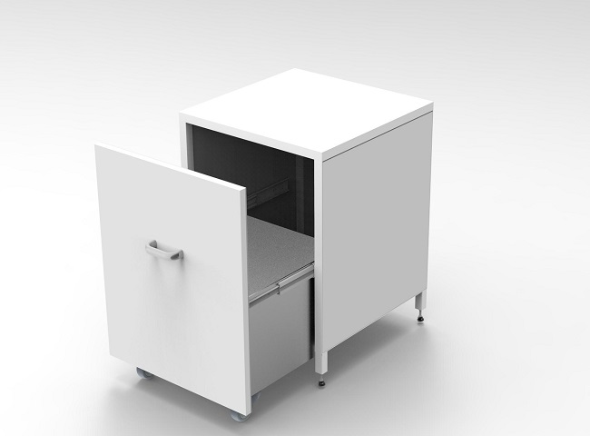 Access to the storage volume is done by pulling the trolley which is supported by 2 wheels and guided by 2 sliding rails.